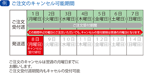 ご注文のキャンセルはご注文締切日の翌日の月曜日までにお願いします